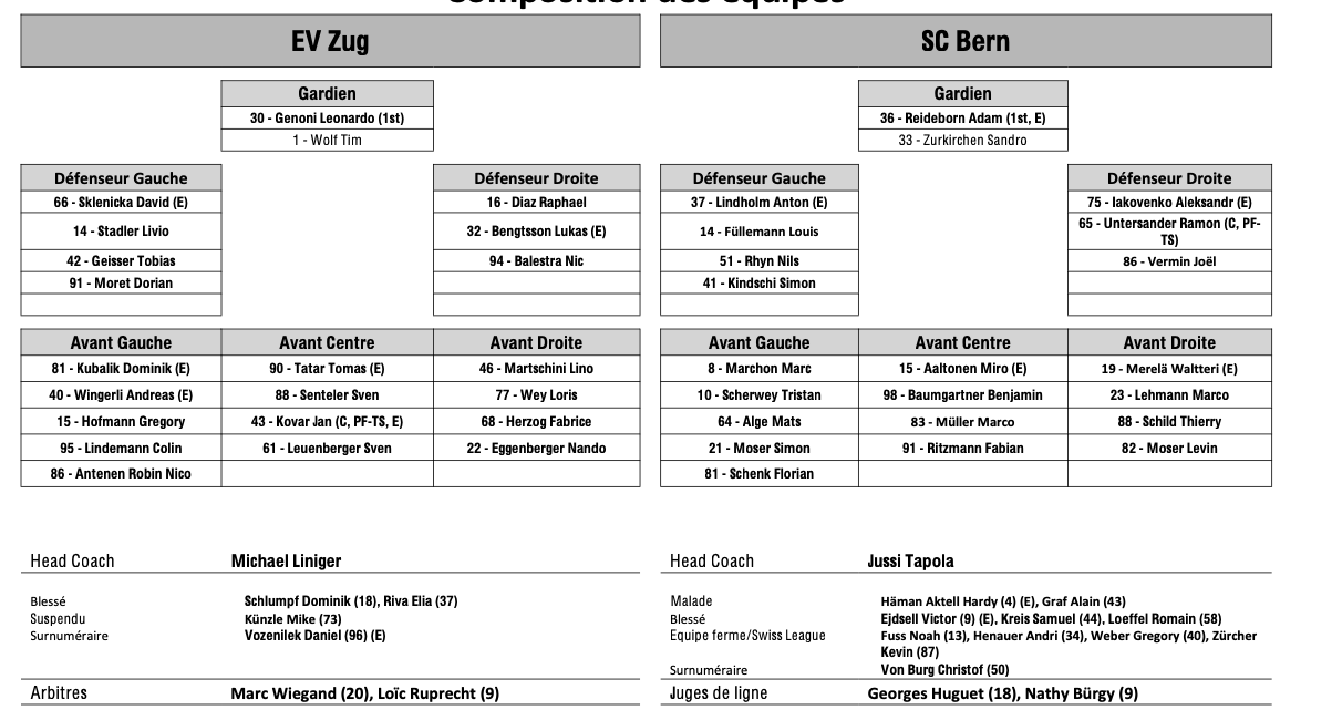 Teamaufstellung und nicht verfügbare Spieler für das Spiel Zug vs. Bern 09/09/2025 Follow SwissHabs Neueste Artikel Vor 16 Stunden Vertragsverlängerungen beim EHC Chur Vor 18 Stunden Diego Kostner fällt einige Wochen aus Vor 18 Stunden Pontus Åberg verbringt die nächsten Spiele in Kloten Vor 20 Stunden Zwei weitere Verstärkungen für den EHC Visp Vor 20 Stunden Freudiges Ereignis für die Familie Björninen