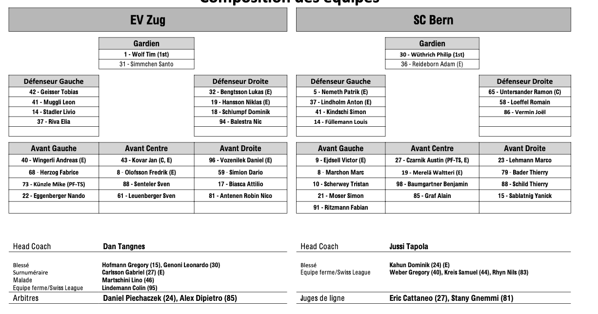 Teamaufstellung und nicht verfügbare Spieler für das Spiel Zug vs. Bern 05/10/2024 Follow SwissHabs Neueste Artikel Vor 58 Minuten Schock für die Stars: Mikko Rantanen verletzt Vor einer Stunde Tarmo Reunanen aus seinem Team ausgeschlossen Vor 2 Stunden Enzo Corvi nähert sich seiner Rückkehr Vor 2 Stunden Dünner fällt aus - Larsson übernimmt als Captain Vor 3 Stunden Basel : Vertragsverlängerung Barbei & Supinski
