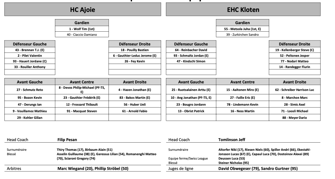 Formation des équipes et joueurs indisponibles pour le match Ajoie vs Kloten 29/11/2022 Follow SwissHabs Derniers articles Il y a 58 minutes Lian Bichsel de retour, Nino Niederreiter blessé Il y a une heure Pénurie d’entraîneurs suisses d’élite en hockey sur glace Il y a 3 heures Un mois d'absence pour Sidney Crosby Il y a 4 heures Changements au sein du département athlétique des SCL Tigers et SCL Young Tigers Il y a 7 heures Djurgården a toujours Emil Bemström dans son viseur
