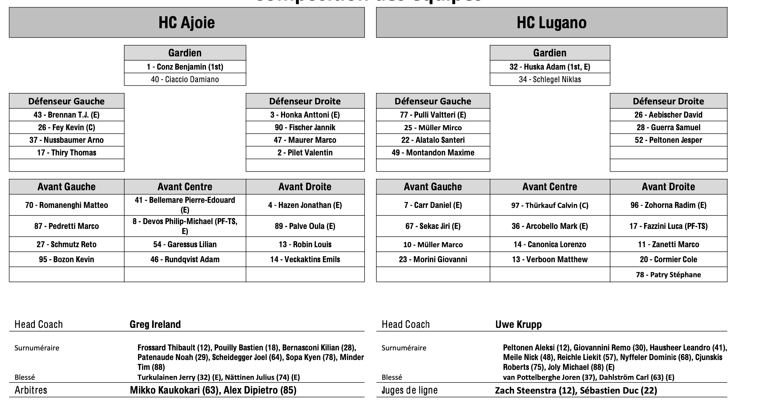 Formation des équipes et joueurs indisponibles pour le match Ajoie vs Lugano 21/03/2025 Follow SwissHabs Derniers articles Il y a 14 heures Régis Fuchs sera honoré cette semaine Il y a 15 heures Prolongations de contrats à l'EHC Coire Il y a 17 heures Diego Kostner absent quelques semaines Il y a 17 heures Pontus Åberg passera les prochains matchs à Kloten Il y a 19 heures Deux autres renforts pour le HC Viège