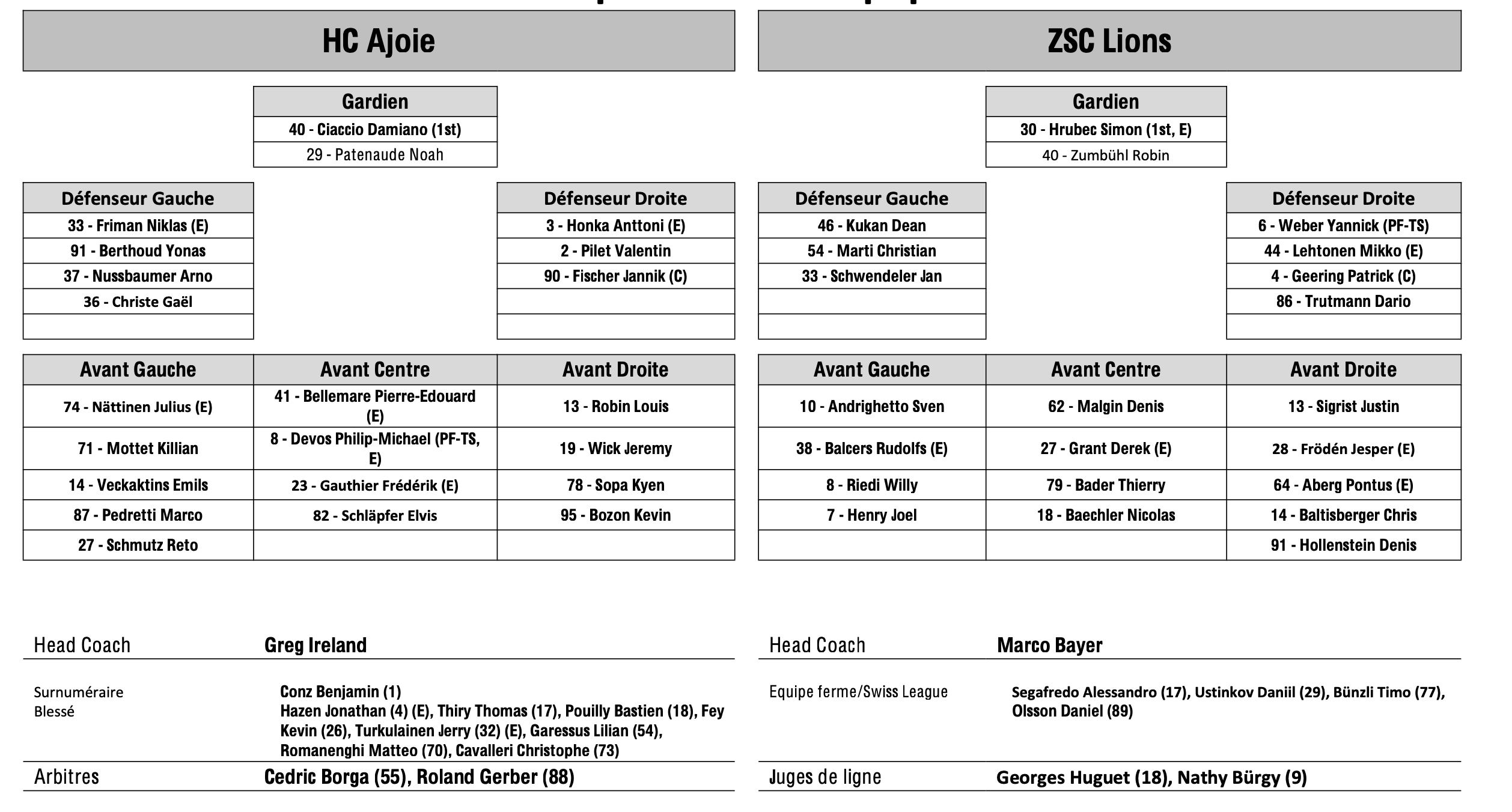 Formation des équipes et joueurs indisponibles pour le match Ajoie vs Zurich 12/09/2025 Follow SwissHabs Derniers articles Il y a 17 heures Régis Fuchs sera honoré cette semaine Il y a 18 heures Prolongations de contrats à l'EHC Coire Il y a 19 heures Diego Kostner absent quelques semaines Il y a 19 heures Pontus Åberg passera les prochains matchs à Kloten Il y a 21 heures Deux autres renforts pour le HC Viège