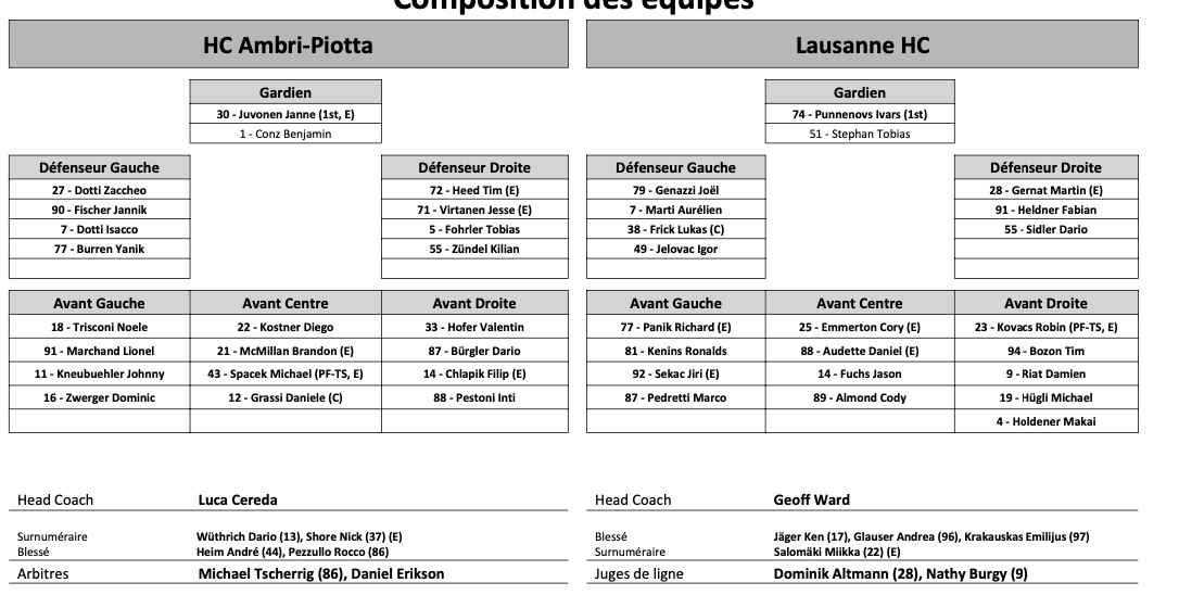 Formation des équipes et joueurs indisponibles pour le match Ambri vs Lausanne 29/11/2022 Follow SwissHabs Derniers articles Il y a 58 minutes Lian Bichsel de retour, Nino Niederreiter blessé Il y a une heure Pénurie d’entraîneurs suisses d’élite en hockey sur glace Il y a 3 heures Un mois d'absence pour Sidney Crosby Il y a 4 heures Changements au sein du département athlétique des SCL Tigers et SCL Young Tigers Il y a 7 heures Djurgården a toujours Emil Bemström dans son viseur
