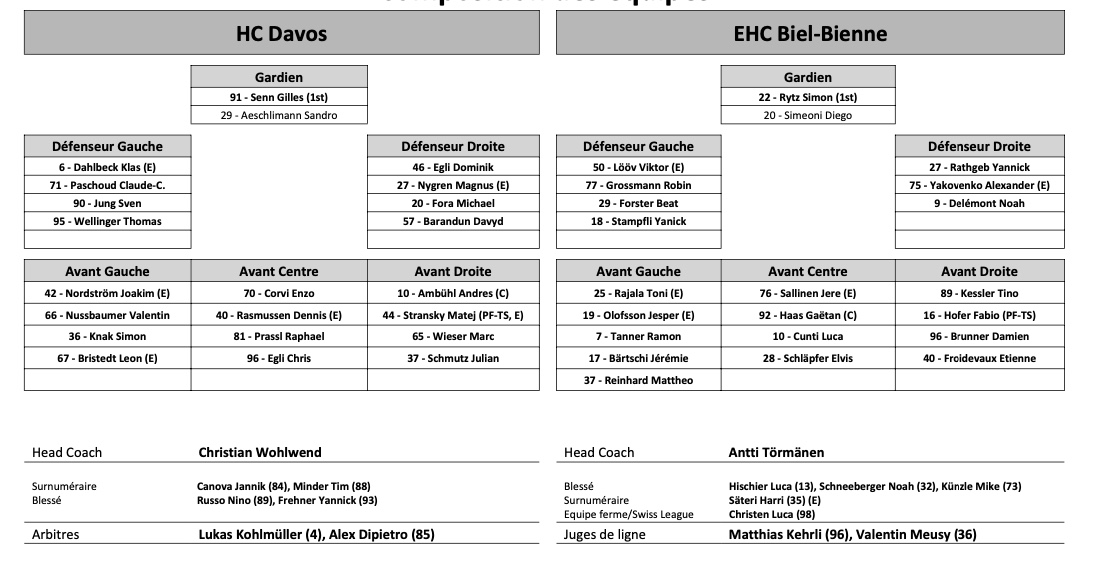 Formation des équipes et joueurs indisponibles pour le match Davos vs Bienne 29/11/2022 Follow SwissHabs Derniers articles Il y a 58 minutes Lian Bichsel de retour, Nino Niederreiter blessé Il y a une heure Pénurie d’entraîneurs suisses d’élite en hockey sur glace Il y a 3 heures Un mois d'absence pour Sidney Crosby Il y a 4 heures Changements au sein du département athlétique des SCL Tigers et SCL Young Tigers Il y a 7 heures Djurgården a toujours Emil Bemström dans son viseur