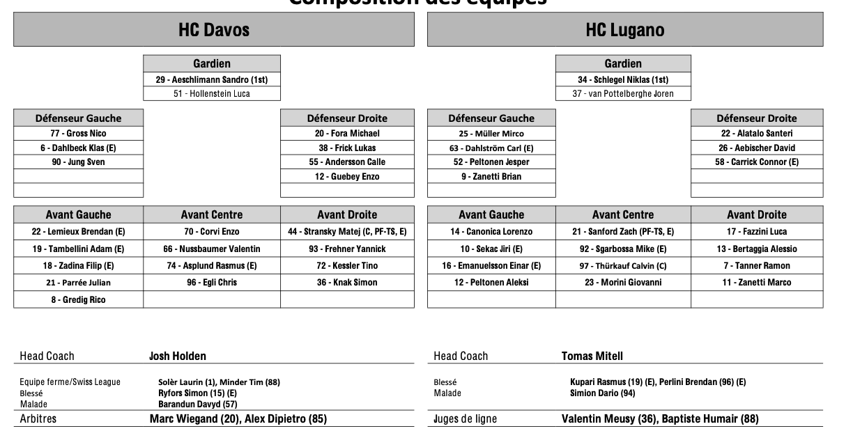 Formation des équipes et joueurs indisponibles pour le match Davos vs Lugano 20/12/2025 Follow SwissHabs Derniers articles Il y a 9 minutes La cuvée de 2026 du Temple de la renommée de la LHJMQ Il y a une heure Echange entre les Penguins de Pittsburgh et l'Avalanche du Colorado Il y a 2 heures Formation des équipes et joueurs indisponibles pour le match Davos vs Langnau Il y a 2 heures Formation des équipes et joueurs indisponibles pour le match Rapperswil vs Genève Il y a 2 heures Formation des équipes et joueurs indisponibles pour le match Ambri vs Lausanne