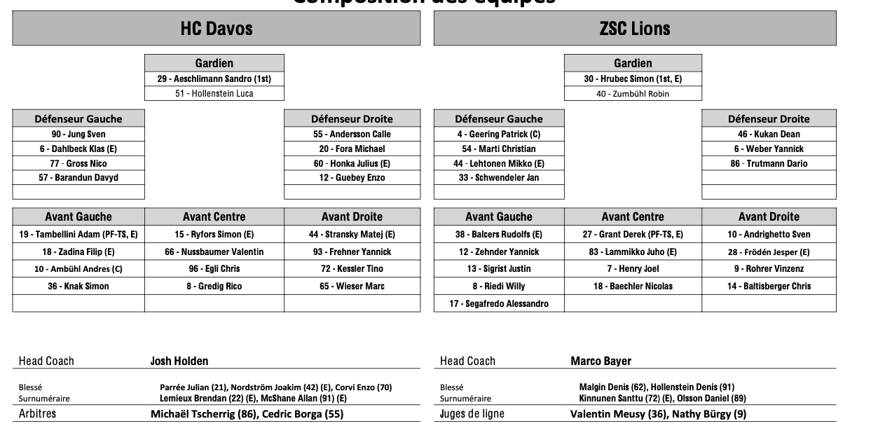 Formation des équipes et joueurs indisponibles pour le match Davos vs Zurich 27/02/2025 Follow SwissHabs Derniers articles Il y a 12 minutes Berne aurait porté son choix sur Ville Peltonen Il y a 30 minutes 700 assists en NHL pour Nikita Kucherov Il y a une heure Tyler Myers sans doute sur le départ Il y a une heure Un 15e but pour Timo Meier mais une défaite pour les Devils Il y a 9 heures Retour de l'action en NHL : quelques chiffres à retenir