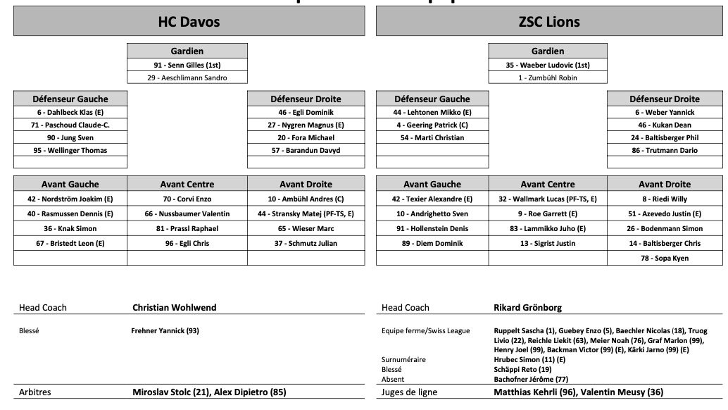 Formation des équipes et joueurs indisponibles pour le match Davos vs Zurich 04/12/2022 Follow SwissHabs Derniers articles Il y a 21 minutes Laure Mériguet revient sur son expérience olympique Il y a 39 minutes Reto Berra et Damiano Ciaccio ne terminent pas le match Il y a 59 minutes La folle et coûteuse nuit dorée de Team USA Il y a une heure Seattle prolonge deux attaquants de soutien Il y a une heure Retour complet sur la soirée de National League