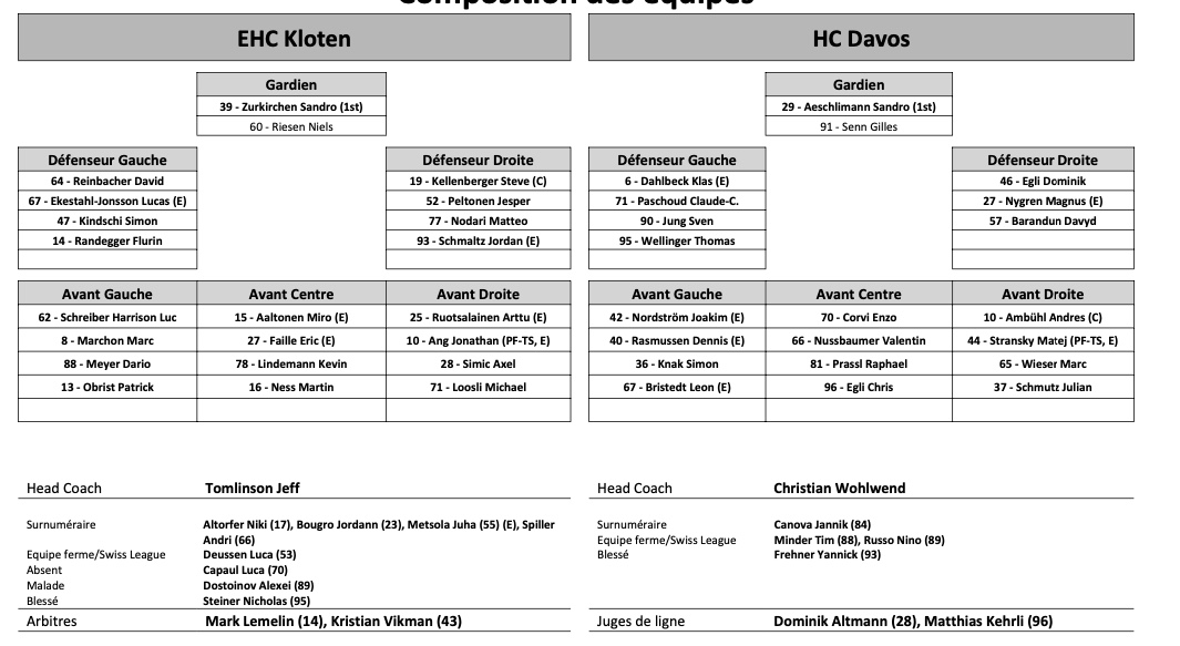 Formation des équipes et joueurs indisponibles pour le match Kloten vs Davos 03/12/2022 Follow SwissHabs Derniers articles Il y a une heure Markus Korhonen va rejoindre Kloten et Simo Vehviläine prendre sa place Il y a 3 heures Laure Mériguet revient sur son expérience olympique Il y a 4 heures Reto Berra et Damiano Ciaccio ne terminent pas le match Il y a 4 heures La folle et coûteuse nuit dorée de Team USA Il y a 4 heures Seattle prolonge deux attaquants de soutien