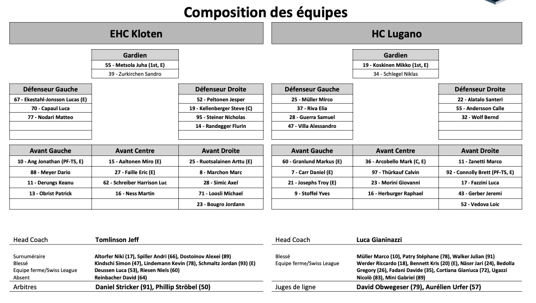 Formation des équipes et joueurs indisponibles pour le match Kloten vs Lugano 23/12/2022 Follow SwissHabs Derniers articles Il y a 34 minutes Formation des équipes et joueurs indisponibles pour le match Davos vs Langnau Il y a 36 minutes Formation des équipes et joueurs indisponibles pour le match Rapperswil vs Genève Il y a 38 minutes Formation des équipes et joueurs indisponibles pour le match Ambri vs Lausanne Il y a 40 minutes Formation des équipes et joueurs indisponibles pour le match Zoug vs Fribourg Il y a 43 minutes Formation des équipes et joueurs indisponibles pour le match Zurich vs Ajoie