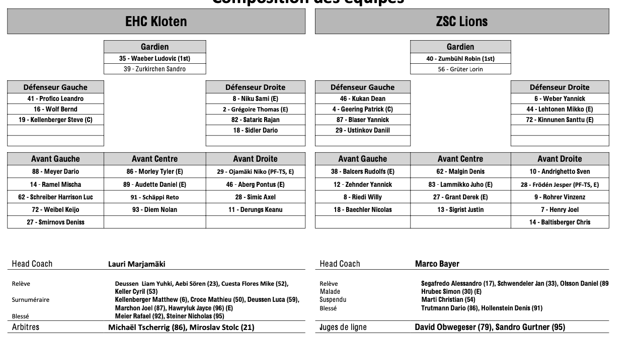 Formation des équipes et joueurs indisponibles pour le match Kloten vs Zurich 19/03/2025 Follow SwissHabs Derniers articles Il y a 17 heures Régis Fuchs sera honoré cette semaine Il y a 18 heures Prolongations de contrats à l'EHC Coire Il y a 20 heures Diego Kostner absent quelques semaines Il y a 20 heures Pontus Åberg passera les prochains matchs à Kloten Il y a 22 heures Deux autres renforts pour le HC Viège