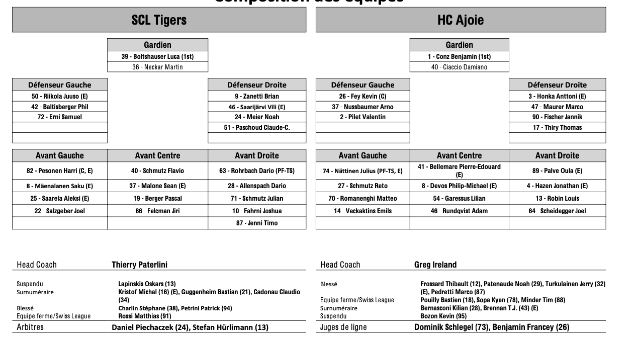 Formation des équipes et joueurs indisponibles pour le match Langnau vs Ajoie 01/03/2025 Follow SwissHabs Derniers articles Il y a 6 heures Retour de l'action en NHL : quelques chiffres à retenir Il y a 7 heures Lian Bichsel de retour, Nino Niederreiter blessé Il y a 8 heures Pénurie d’entraîneurs suisses d’élite en hockey sur glace Il y a 10 heures Un mois d'absence pour Sidney Crosby Il y a 11 heures Changements au sein du département athlétique des SCL Tigers et SCL Young Tigers