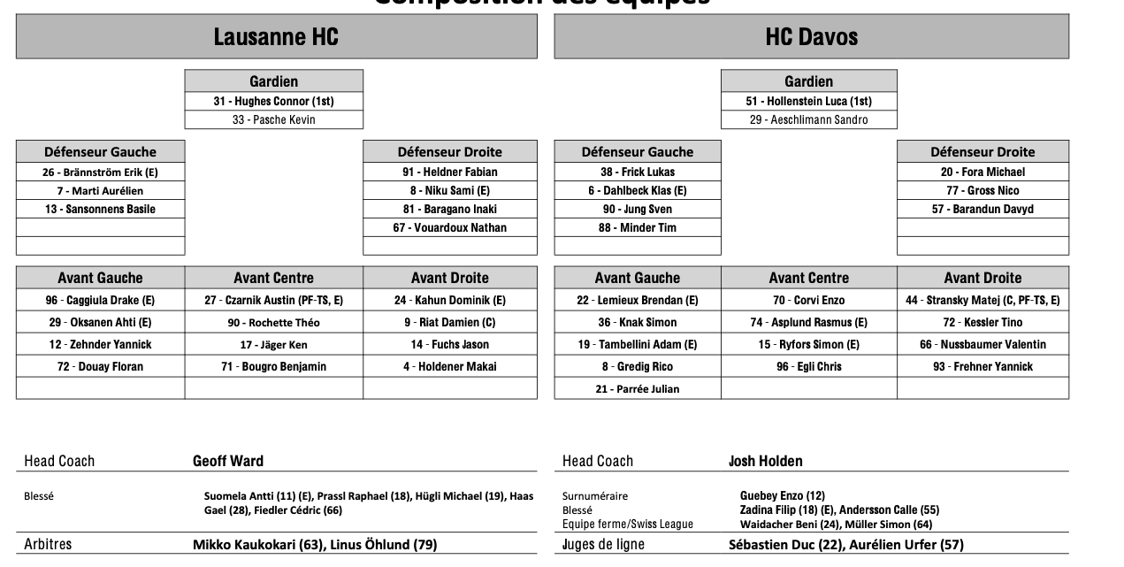 Formation des équipes et joueurs indisponibles pour le match Lausanne vs Davos 29/10/2025 Follow SwissHabs Derniers articles Il y a 11 heures Régis Fuchs sera honoré cette semaine Il y a 12 heures Prolongations de contrats à l'EHC Coire Il y a 13 heures Diego Kostner absent quelques semaines Il y a 13 heures Pontus Åberg passera les prochains matchs à Kloten Il y a 15 heures Deux autres renforts pour le HC Viège