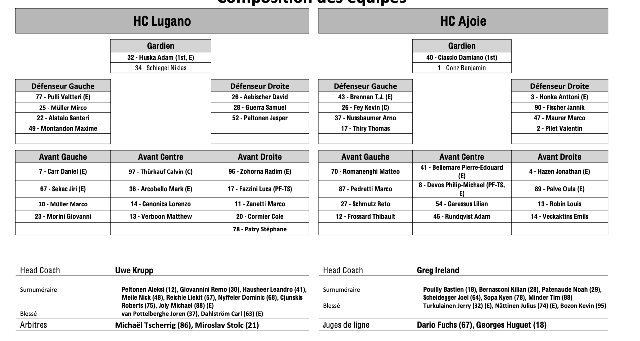 Formation des équipes et joueurs indisponibles pour le match Lugano vs Ajoie 23/03/2025 Follow SwissHabs Derniers articles Il y a 11 heures Régis Fuchs sera honoré cette semaine Il y a 12 heures Prolongations de contrats à l'EHC Coire Il y a 13 heures Diego Kostner absent quelques semaines Il y a 13 heures Pontus Åberg passera les prochains matchs à Kloten Il y a 15 heures Deux autres renforts pour le HC Viège