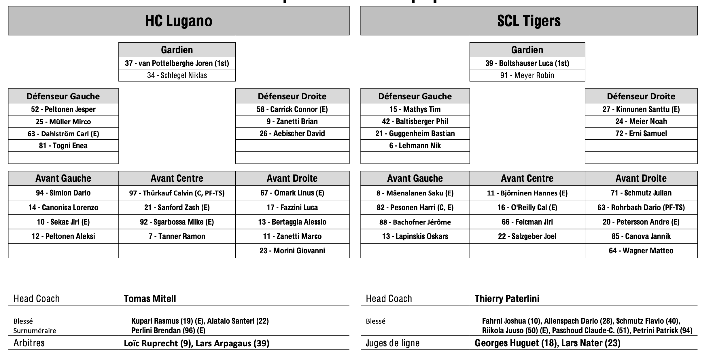 Formation des équipes et joueurs indisponibles pour le match Lugano vs Langnau 10/10/2025 Follow SwissHabs Derniers articles Il y a 12 heures Régis Fuchs sera honoré cette semaine Il y a 13 heures Prolongations de contrats à l'EHC Coire Il y a 14 heures Diego Kostner absent quelques semaines Il y a 15 heures Pontus Åberg passera les prochains matchs à Kloten Il y a 16 heures Deux autres renforts pour le HC Viège