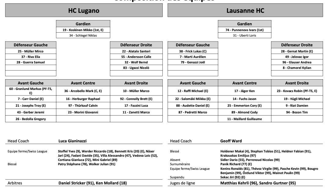 Formation des équipes et joueurs indisponibles pour le match Lugano vs Lausanne 02/01/2023 Follow SwissHabs Derniers articles Il y a une heure Laure Mériguet revient sur son expérience olympique Il y a une heure Reto Berra et Damiano Ciaccio ne terminent pas le match Il y a 2 heures La folle et coûteuse nuit dorée de Team USA Il y a 2 heures Seattle prolonge deux attaquants de soutien Il y a 2 heures Retour complet sur la soirée de National League