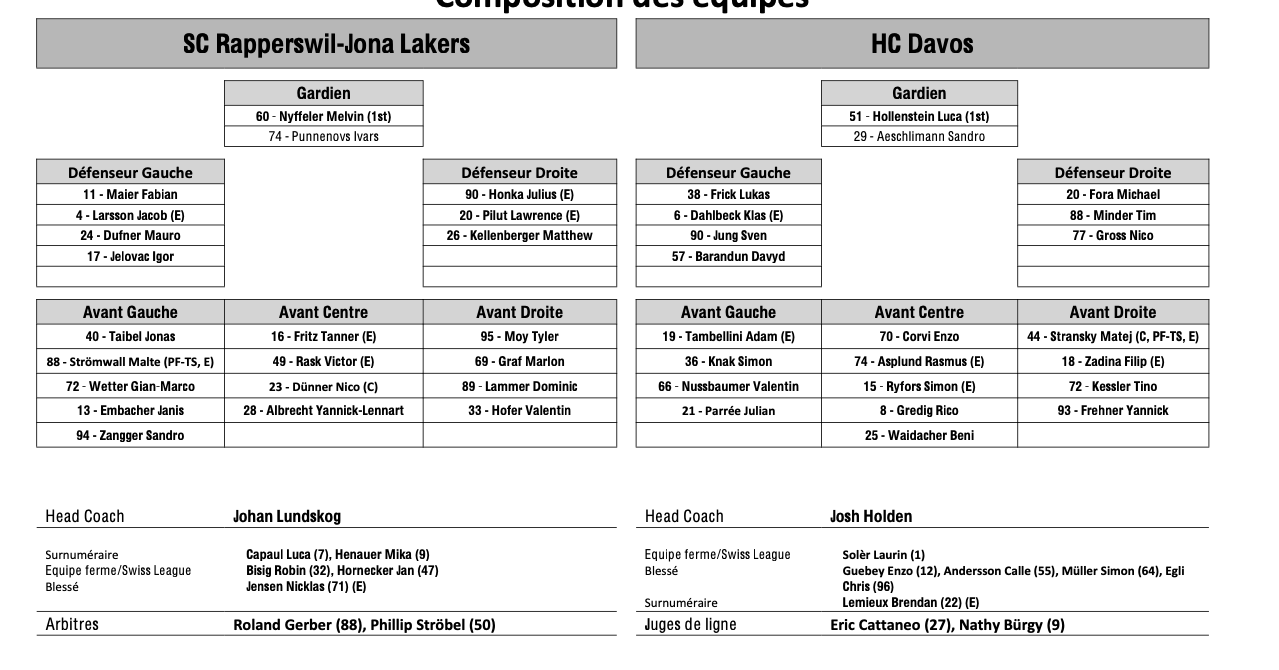 Formation des équipes et joueurs indisponibles pour le match Rapperswil vs Davos 30/09/2025 Follow SwissHabs Derniers articles Il y a 12 heures Régis Fuchs sera honoré cette semaine Il y a 13 heures Prolongations de contrats à l'EHC Coire Il y a 14 heures Diego Kostner absent quelques semaines Il y a 15 heures Pontus Åberg passera les prochains matchs à Kloten Il y a 16 heures Deux autres renforts pour le HC Viège
