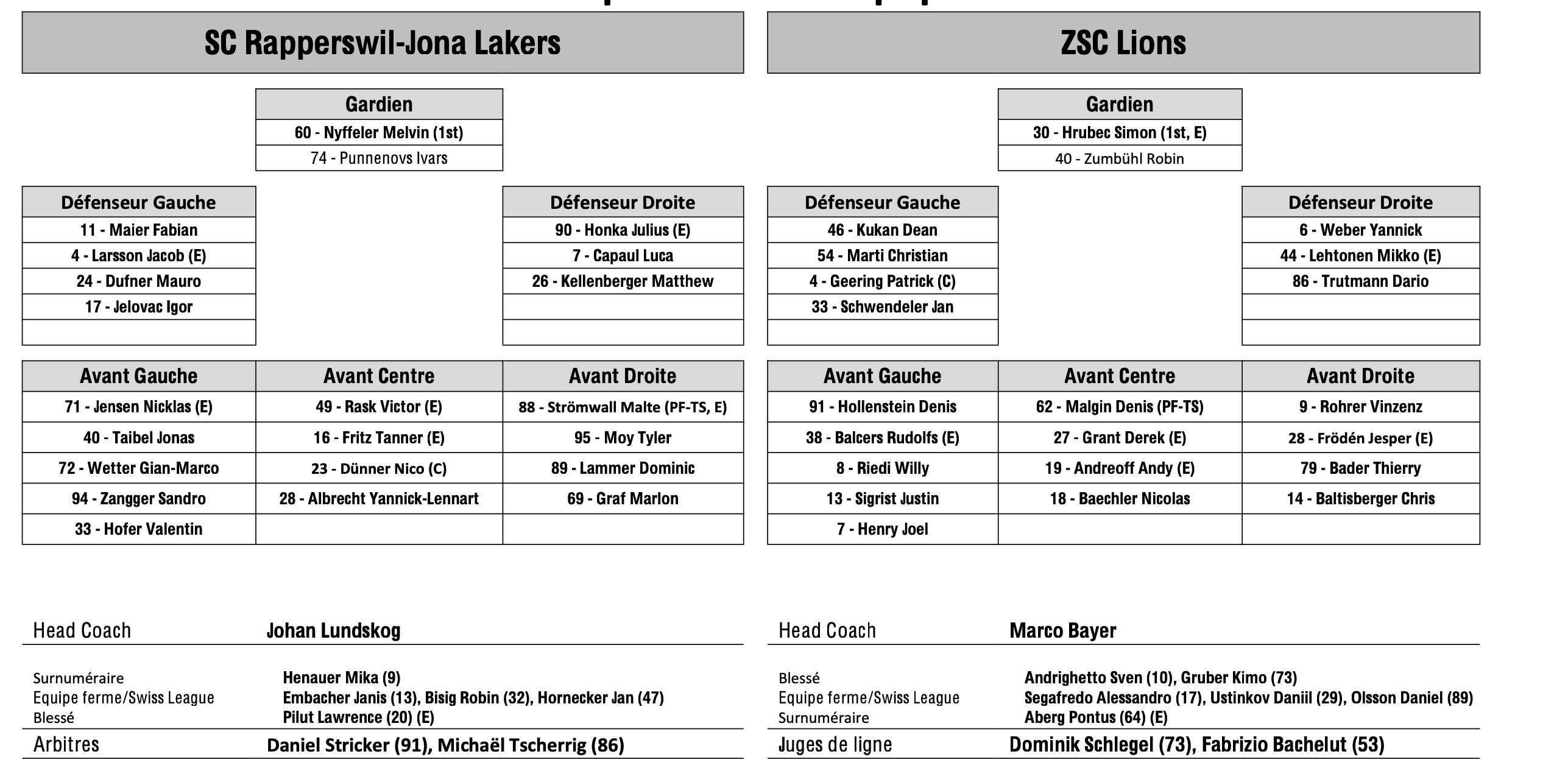 Formation des équipes et joueurs indisponibles pour le match Rapperswil vs Zurich 10/10/2025 Follow SwissHabs Derniers articles Il y a 12 heures Régis Fuchs sera honoré cette semaine Il y a 13 heures Prolongations de contrats à l'EHC Coire Il y a 14 heures Diego Kostner absent quelques semaines Il y a 15 heures Pontus Åberg passera les prochains matchs à Kloten Il y a 16 heures Deux autres renforts pour le HC Viège