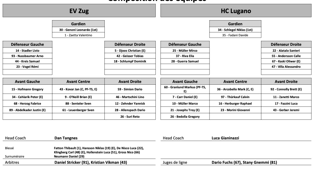 Formation des équipes et joueurs indisponibles pour le match Zoug vs Lugano 29/11/2022 Follow SwissHabs Derniers articles Il y a 58 minutes Lian Bichsel de retour, Nino Niederreiter blessé Il y a une heure Pénurie d’entraîneurs suisses d’élite en hockey sur glace Il y a 3 heures Un mois d'absence pour Sidney Crosby Il y a 4 heures Changements au sein du département athlétique des SCL Tigers et SCL Young Tigers Il y a 7 heures Djurgården a toujours Emil Bemström dans son viseur