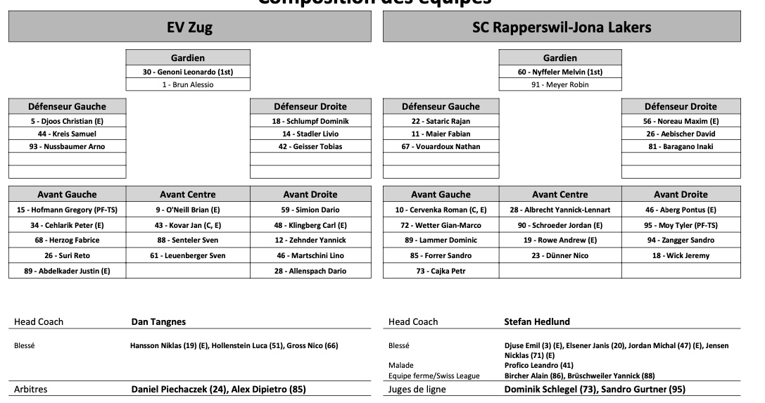 Formation des équipes et joueurs indisponibles pour le match Zoug vs Rapperswil 23/12/2022 Follow SwissHabs Derniers articles Il y a 7 minutes Les Blues acquièrent Gauthier dans un échange avec les Islanders Il y a 49 minutes Mikko Rantanen blessé et absent avec les Stars après les JO Il y a une heure Tarmo Reunanen a été exclu de son équipe Il y a une heure Enzo Corvi se rapproche d'un retour au jeu Il y a 2 heures Nico Dünner blessé : Jacob Larsson nouveau capitaine des Rapperswil-Jona Lakers