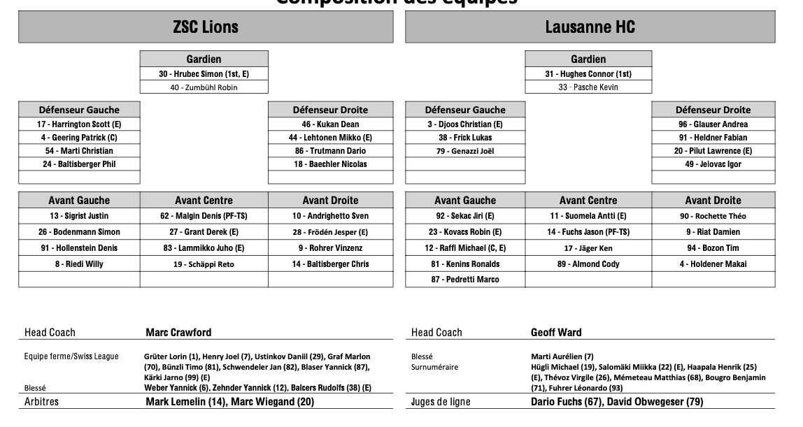 Formation des équipes et joueurs indisponibles pour le match Zurich vs Lausanne 30/04/2024 Follow SwissHabs Derniers articles Il y a 4 heures Retour de l'action en NHL : quelques chiffres à retenir Il y a 6 heures Lian Bichsel de retour, Nino Niederreiter blessé Il y a 7 heures Pénurie d’entraîneurs suisses d’élite en hockey sur glace Il y a 8 heures Un mois d'absence pour Sidney Crosby Il y a 10 heures Changements au sein du département athlétique des SCL Tigers et SCL Young Tigers