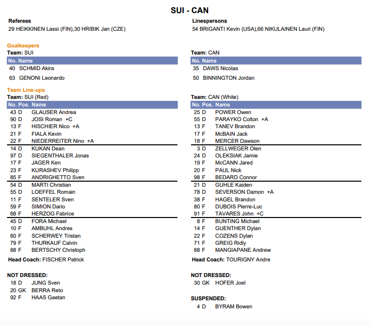 Formation des équipes pour le match Suisse vs Canada 19/05/2024 Follow SwissHabs Derniers articles Il y a une minute Le EHC Bâle prolonge Barbei et Supinski Il y a 13 minutes Ajoie se renforce avec Tarmo Reunanen pour cette fin de saison Il y a 24 minutes Trois joueurs absents du côté de Genève Il y a une heure Des nouvelles de l'infirmerie du HC Bienne Il y a 3 heures Nolan Diem portera les couleurs d'Ajoie