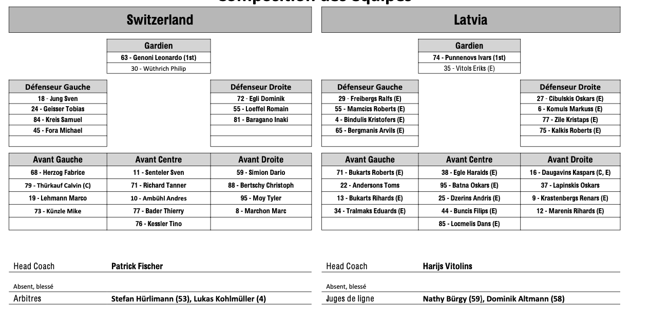 Formation des équipes pour le match Suisse vs Lettonie 26/04/2024 Follow SwissHabs Derniers articles Il y a 12 minutes Berne aurait porté son choix sur Ville Peltonen Il y a 30 minutes 700 assists en NHL pour Nikita Kucherov Il y a une heure Tyler Myers sans doute sur le départ Il y a une heure Un 15e but pour Timo Meier mais une défaite pour les Devils Il y a 9 heures Retour de l'action en NHL : quelques chiffres à retenir