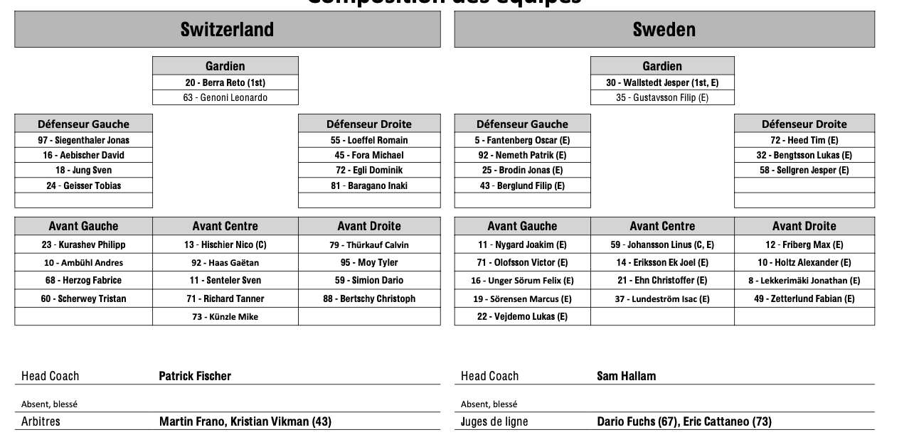 Formation des équipes pour le match Suisse vs Suède 02/05/2024 Follow SwissHabs Derniers articles Il y a 52 minutes Retour de l'action en NHL : quelques chiffres à retenir Il y a 2 heures Lian Bichsel de retour, Nino Niederreiter blessé Il y a 3 heures Pénurie d’entraîneurs suisses d’élite en hockey sur glace Il y a 5 heures Un mois d'absence pour Sidney Crosby Il y a 6 heures Changements au sein du département athlétique des SCL Tigers et SCL Young Tigers