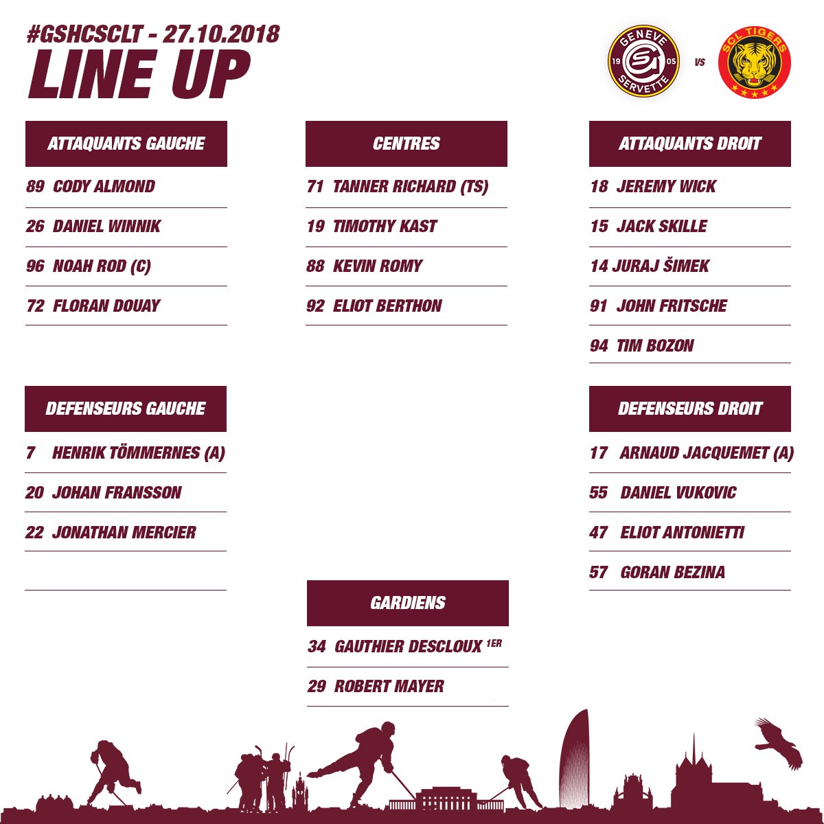 Formation des équipes pour les matchs du jour en National League 27/10/2018 Follow SwissHabs Derniers articles Il y a 12 minutes Changements au sein du département athlétique des SCL Tigers et SCL Young Tigers Il y a 2 heures Djurgården a toujours Emil Bemström dans son viseur Il y a 2 heures Grégory Hofmann en lice pour le plus beau but de cette saison de Champions Hockey League Il y a 4 heures Une nouvelle signature du côté d'Ajoie Il y a 5 heures Un match de suspension et une amende contre Jens Nater