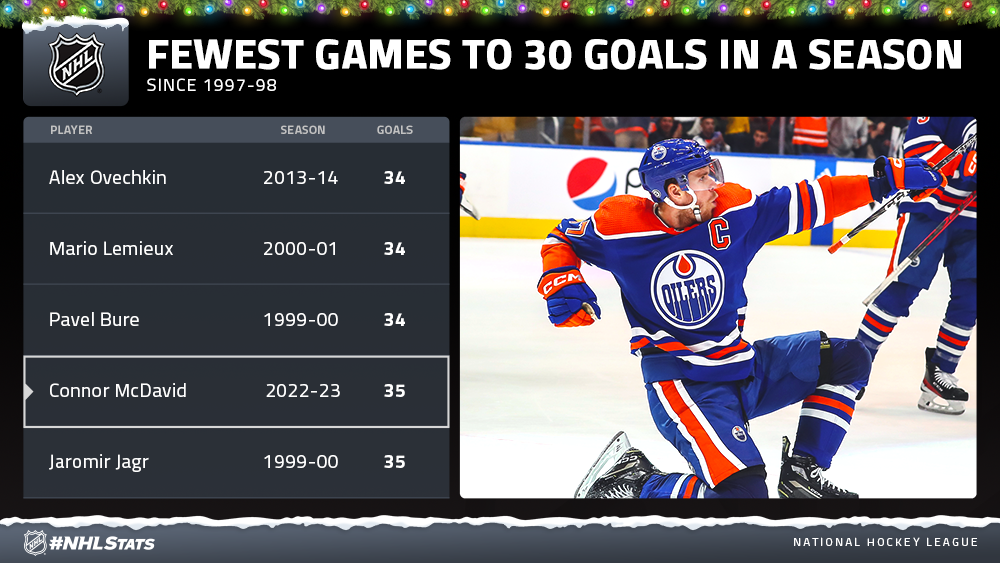 * Connor McDavid est devenu le premier joueur de la saison à atteindre 30 buts et a prolongé sa série de points à 15 matchs ou plus pour la troisième fois de sa carrière (également 17 GP et 15 GP en 2021-22). Le seul joueur actif à en avoir autant est Patrick Kane (26 GP en 2015-16, 20 GP en 2018-19 & 15 GP 2019-20).