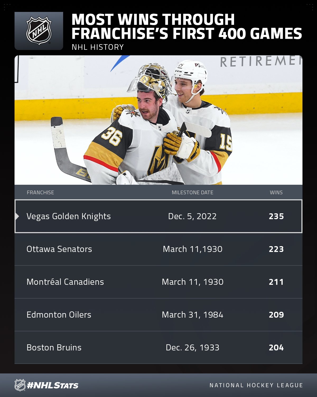 Les Golden Knights sont la nouvelle franchise la plus victorieuse après 400 matchs joués 06/12/2022 Follow SwissHabs Derniers articles Il y a 28 secondes Retour complet sur la soirée de National League Il y a 8 heures Les Scorer King de Swiss League vont être tous mignons Il y a 8 heures La cuvée de 2026 du Temple de la renommée de la LHJMQ Il y a 10 heures Echange entre les Penguins de Pittsburgh et l'Avalanche du Colorado Il y a 10 heures Formation des équipes et joueurs indisponibles pour le match Davos vs Langnau