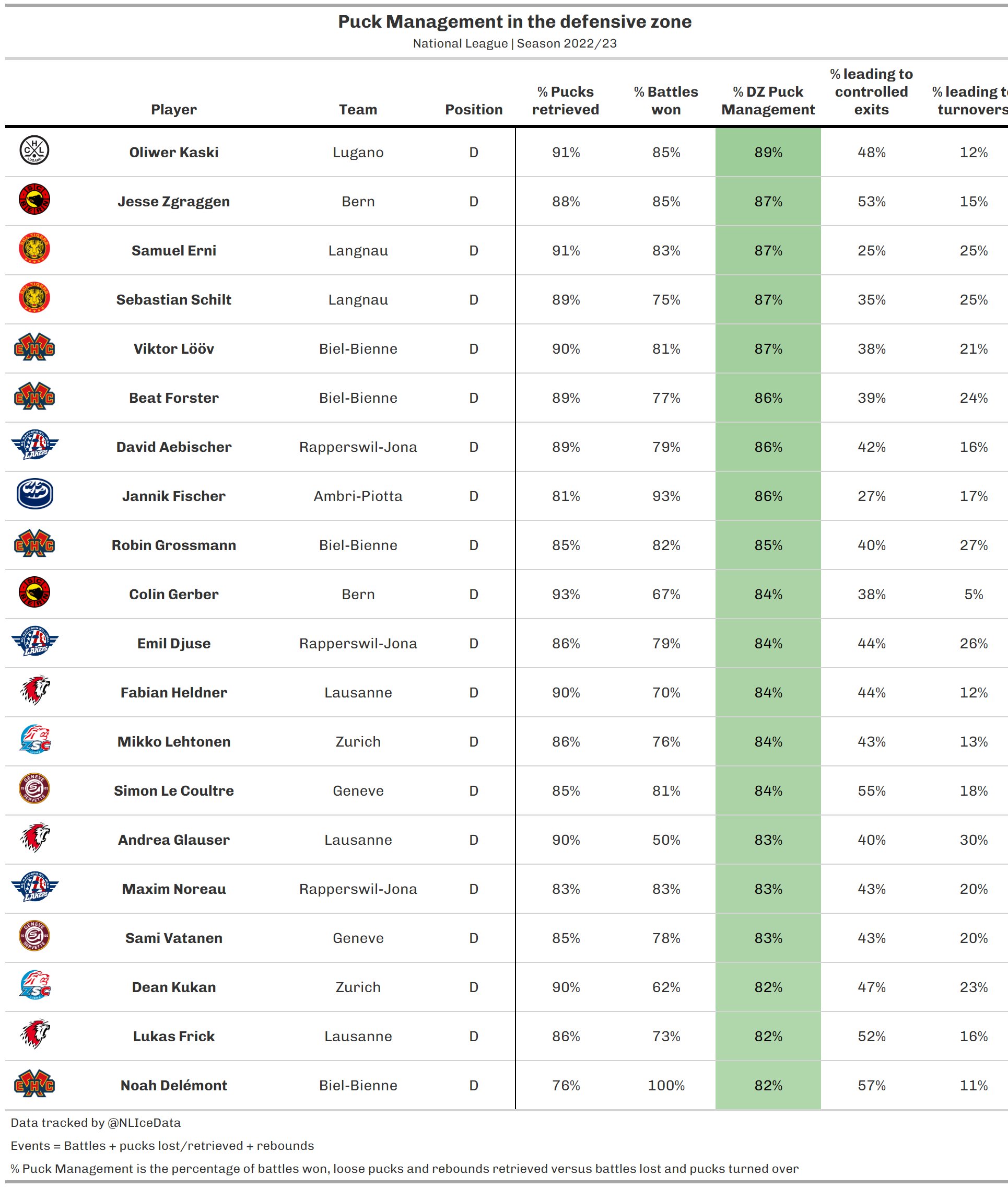 Quels défenseurs de National League sont les plus efficaces pour récupérer des pucks dans leur zone défensive ? 25/11/2022 Follow SwissHabs Derniers articles Il y a 12 minutes Berne aurait porté son choix sur Ville Peltonen Il y a 30 minutes 700 assists en NHL pour Nikita Kucherov Il y a une heure Tyler Myers sans doute sur le départ Il y a une heure Un 15e but pour Timo Meier mais une défaite pour les Devils Il y a 9 heures Retour de l'action en NHL : quelques chiffres à retenir