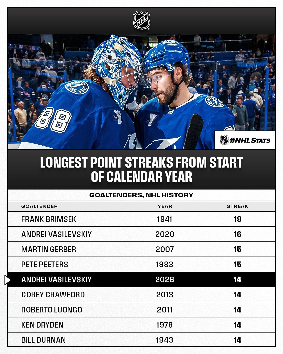 Andrei Vasilevskiy, der im Jahr 2026 weiterhin in der regulären Spielzeit ungeschlagen ist, hat den Tampa Bay Lightning zu ihrem sechsten Sieg in Folge verholfen und eine Bilanz von 9-1-0 in ihren letzten 10 Spielen erzielt.