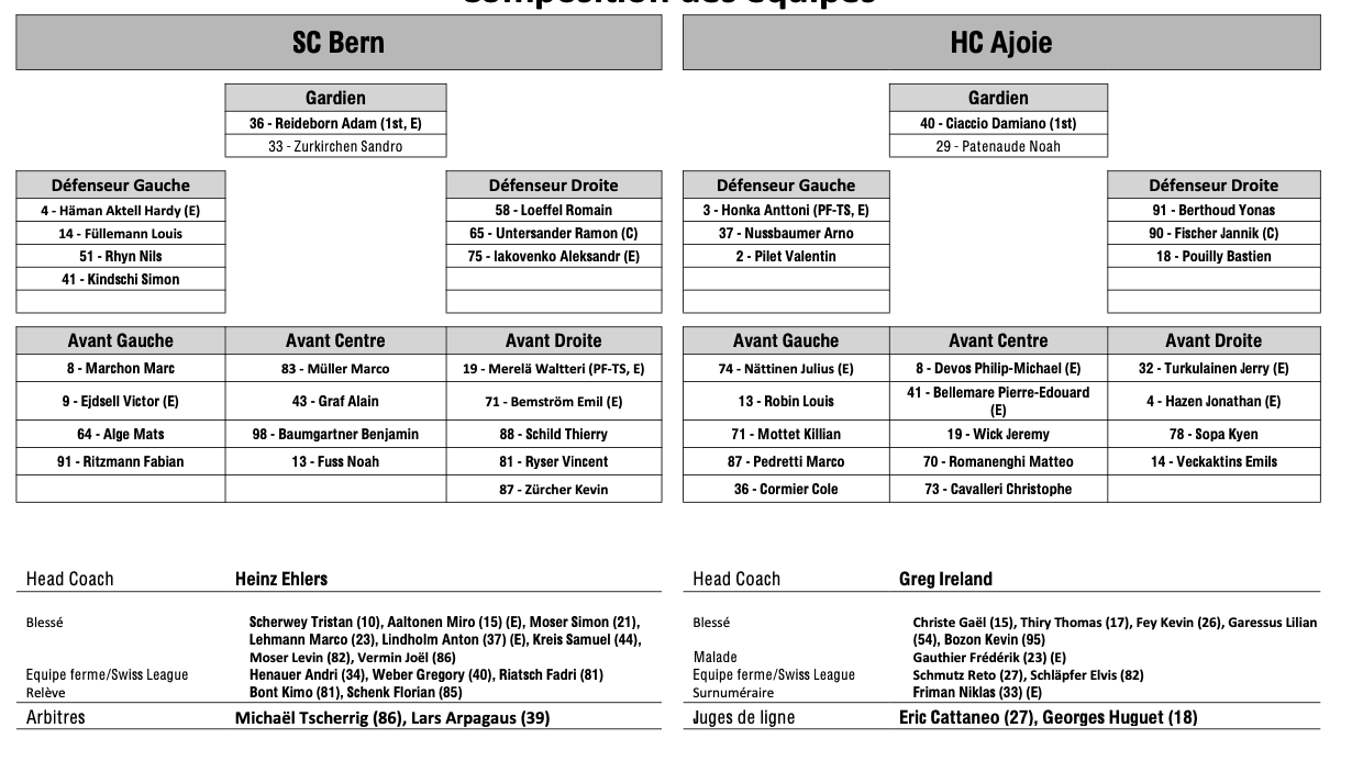 Teamaufstellung und nicht verfügbare Spieler für das Spiel Bern vs Ajoie 28/10/2025 Follow SwissHabs Neueste Artikel Vor 19 Stunden Vertragsverlängerungen beim EHC Chur Vor 21 Stunden Diego Kostner fällt einige Wochen aus Vor 21 Stunden Pontus Åberg verbringt die nächsten Spiele in Kloten Vor 23 Stunden Zwei weitere Verstärkungen für den EHC Visp Vor 23 Stunden Freudiges Ereignis für die Familie Björninen