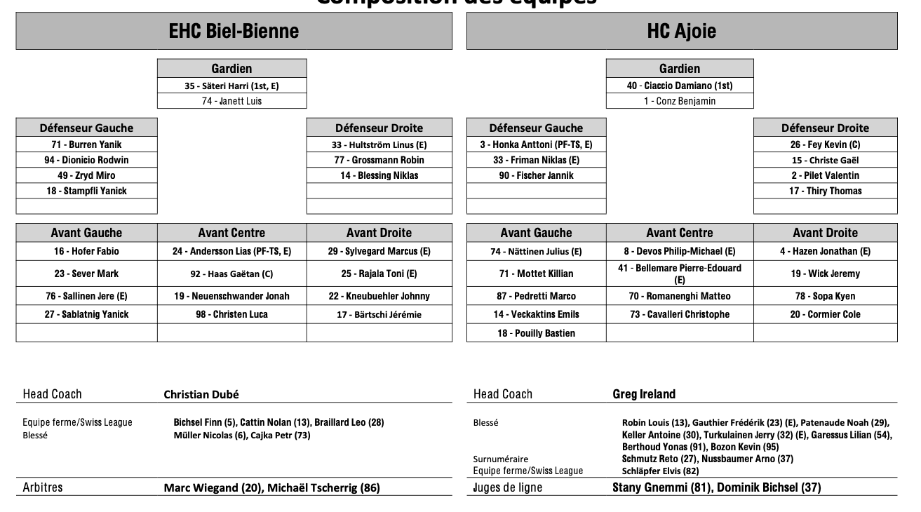 Teamaufstellung und nicht verfügbare Spieler für das Spiel Biel vs Ajoie 27/01/2026 Follow SwissHabs Neueste Artikel Vor 18 Stunden Vertragsverlängerungen beim EHC Chur Vor 20 Stunden Diego Kostner fällt einige Wochen aus Vor 20 Stunden Pontus Åberg verbringt die nächsten Spiele in Kloten Vor 22 Stunden Zwei weitere Verstärkungen für den EHC Visp Vor 22 Stunden Freudiges Ereignis für die Familie Björninen