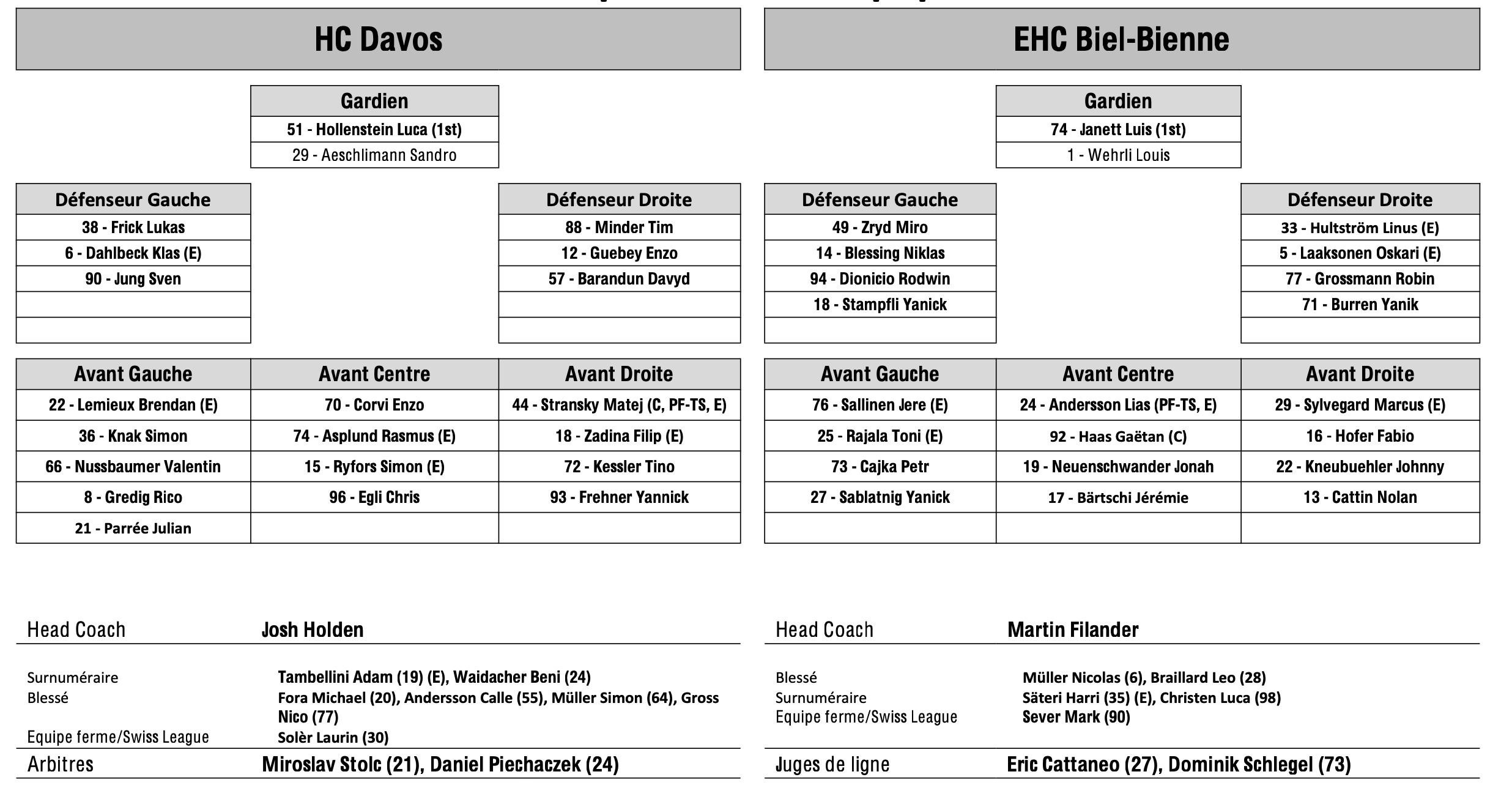Teamaufstellung und nicht verfügbare Spieler für das Spiel Davos vs Biel 21/10/2025 Follow SwissHabs Neueste Artikel Vor 32 Minuten Ein Spiel Sperre und eine Geldstrafe gegen Jens Nater Vor 2 Stunden Markus Korhonen wechselt nach Kloten, Simo Vehviläinen übernimmt seinen Posten Vor 4 Stunden Reto Berra und Damiano Ciaccio beenden das Spiel nicht Vor 5 Stunden Die wilde und teure goldene Nacht des Team USA Vor 14 Stunden Die Scorer Kings der Swiss League werden alle knuffig sein