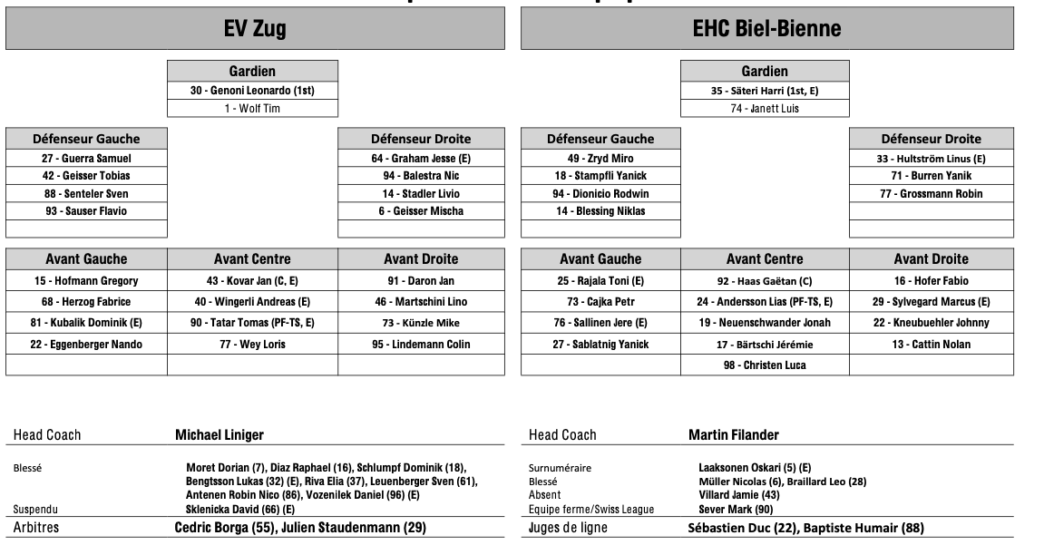 Teamaufstellung und nicht verfügbare Spieler für das Spiel Zug vs. Biel 19/10/2025 Follow SwissHabs Neueste Artikel Vor 27 Minuten Markus Korhonen wechselt nach Kloten, Simo Vehviläinen übernimmt seinen Posten Vor 3 Stunden Reto Berra und Damiano Ciaccio beenden das Spiel nicht Vor 3 Stunden Die wilde und teure goldene Nacht des Team USA Vor 12 Stunden Die Scorer Kings der Swiss League werden alle knuffig sein Vor 14 Stunden Aufstellung und Ausfälle: Davos gegen Langnau