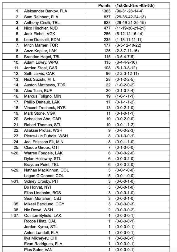 Barkov figurait sur 173 des 191 bulletins de vote, arrivant en tête sur 96 d’entre eux, pour un total de 1’363 points. Son coéquipier Sam Reinhart, nommé pour la première fois, a terminé deuxième avec 837 points, dont 29 votes de première place. Anthony Cirelli (Tampa Bay), également finaliste pour la première fois, a pris la troisième place avec 828 points, lui aussi crédité de 29 votes en tête de liste.