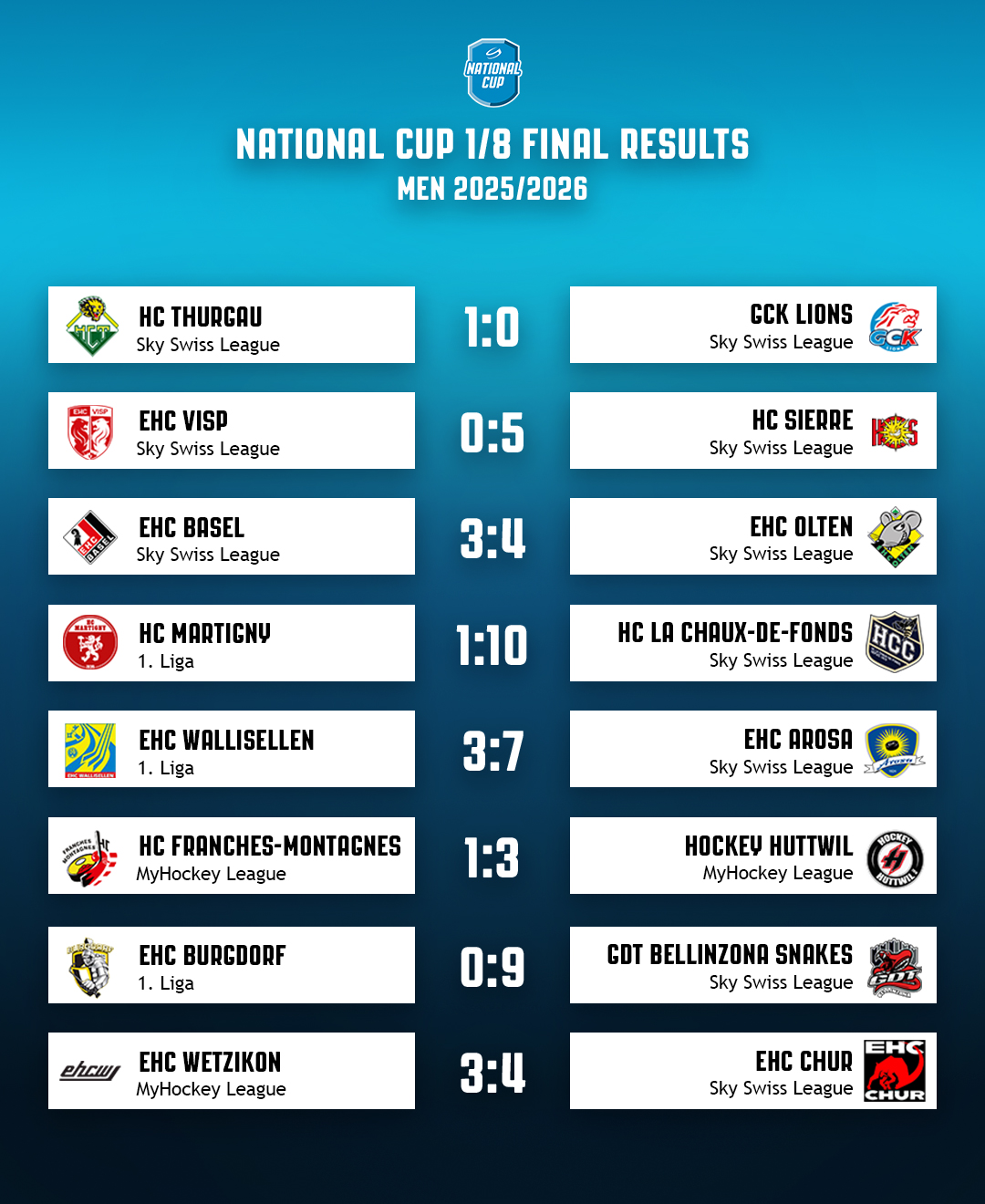 Aperçu des résultats des 1/8 de finale de la National Cup masculine 16/10/2025 Follow SwissHabs Derniers articles Il y a 50 minutes Le point sur l'effectif du CP Berne Il y a une heure JO : quel impact sur le développement du hockey aux Etats-Unis ? Il y a une heure Raphael Diaz va faire son retour au jeu face à Fribourg Il y a 2 heures Des nouvelles très mitigées concernant Marcus Sörensen Il y a 2 heures Un autre gardien à disposition du HC Ajoie