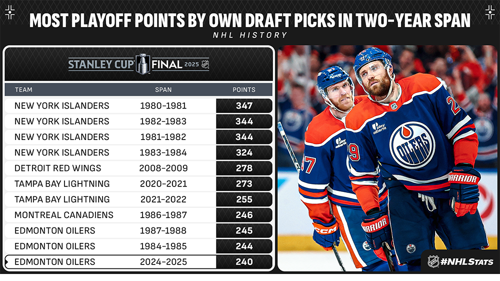 Connor McDavid (1er choix en 2015) pour Edmonton et Aleksander Barkov (2e choix en 2013) pour la Floride illustrent la réussite du développement interne. Les choix des Oilers ont d’ailleurs été particulièrement prolifiques en séries cette année, totalisant 91 points, un sommet dans la LNH (les choix des Panthers en comptent 45). L’an dernier, les joueurs repêchés par Edmonton avaient cumulé 149 points, soit le 6e total le plus élevé pour une équipe en une seule année dans l’histoire des séries.