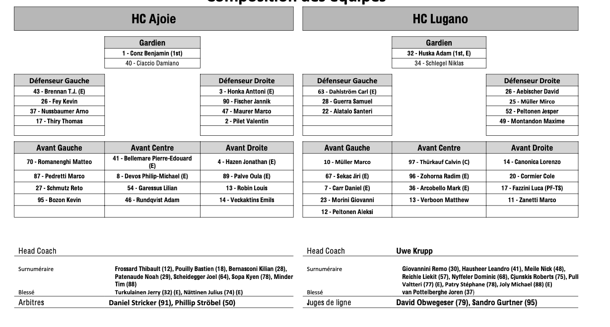 Formation des équipes et joueurs indisponibles pour le match Ajoie vs Lugano 17/03/2025 Follow SwissHabs Derniers articles Il y a 4 minutes Ajoie se renforce avec Tarmo Reunanen pour cette fin de saison Il y a 15 minutes Trois joueurs absents du côté de Genève Il y a une heure Des nouvelles de l'infirmerie du HC Bienne Il y a 3 heures Nolan Diem portera les couleurs d'Ajoie Il y a 4 heures Le point sur l'effectif du CP Berne