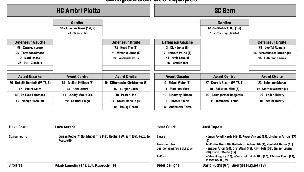Formation des équipes et joueurs indisponibles pour le match Ambri vs Berne 27/02/2025 Follow SwissHabs Derniers articles Il y a 7 heures Retour de l'action en NHL : quelques chiffres à retenir Il y a 9 heures Lian Bichsel de retour, Nino Niederreiter blessé Il y a 10 heures Pénurie d’entraîneurs suisses d’élite en hockey sur glace Il y a 11 heures Un mois d'absence pour Sidney Crosby Il y a 13 heures Changements au sein du département athlétique des SCL Tigers et SCL Young Tigers