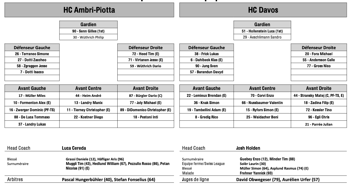 Formation des équipes et joueurs indisponibles pour le match Ambri vs Davos 05/10/2025 Follow SwissHabs Derniers articles Il y a 15 heures Régis Fuchs sera honoré cette semaine Il y a 16 heures Prolongations de contrats à l'EHC Coire Il y a 18 heures Diego Kostner absent quelques semaines Il y a 18 heures Pontus Åberg passera les prochains matchs à Kloten Il y a 20 heures Deux autres renforts pour le HC Viège