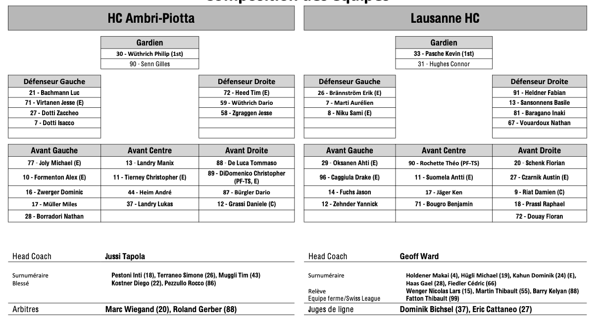 Formation des équipes et joueurs indisponibles pour le match Ambri vs Lausanne 24/02/2026 Follow SwissHabs Derniers articles Il y a une heure Echange entre les Penguins de Pittsburgh et l'Avalanche du Colorado Il y a 2 heures Formation des équipes et joueurs indisponibles pour le match Davos vs Langnau Il y a 2 heures Formation des équipes et joueurs indisponibles pour le match Rapperswil vs Genève Il y a 2 heures Formation des équipes et joueurs indisponibles pour le match Ambri vs Lausanne Il y a 2 heures Formation des équipes et joueurs indisponibles pour le match Zoug vs Fribourg