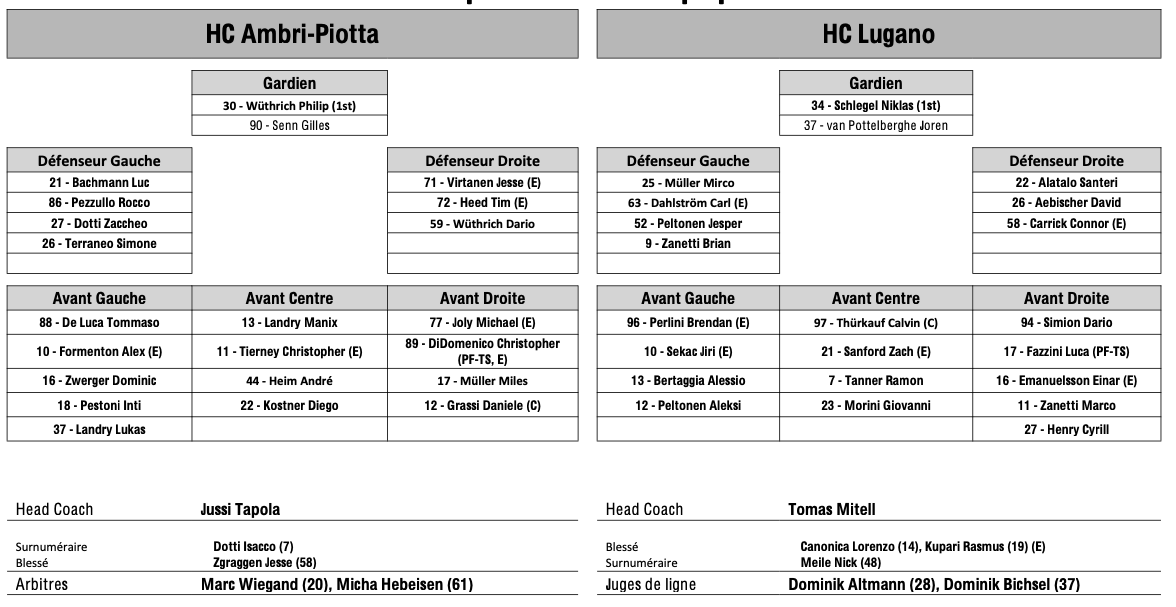 Formation des équipes et joueurs indisponibles pour le match Ambri vs Lugano 29/01/2026 Follow SwissHabs Derniers articles Il y a 14 heures Régis Fuchs sera honoré cette semaine Il y a 15 heures Prolongations de contrats à l'EHC Coire Il y a 17 heures Diego Kostner absent quelques semaines Il y a 17 heures Pontus Åberg passera les prochains matchs à Kloten Il y a 19 heures Deux autres renforts pour le HC Viège