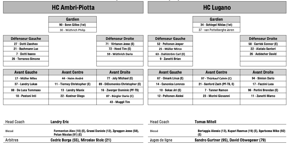 Formation des équipes et joueurs indisponibles pour le match Ambri vs Lugano 28/10/2025 Follow SwissHabs Derniers articles Il y a 17 heures Régis Fuchs sera honoré cette semaine Il y a 18 heures Prolongations de contrats à l'EHC Coire Il y a 20 heures Diego Kostner absent quelques semaines Il y a 20 heures Pontus Åberg passera les prochains matchs à Kloten Il y a 22 heures Deux autres renforts pour le HC Viège