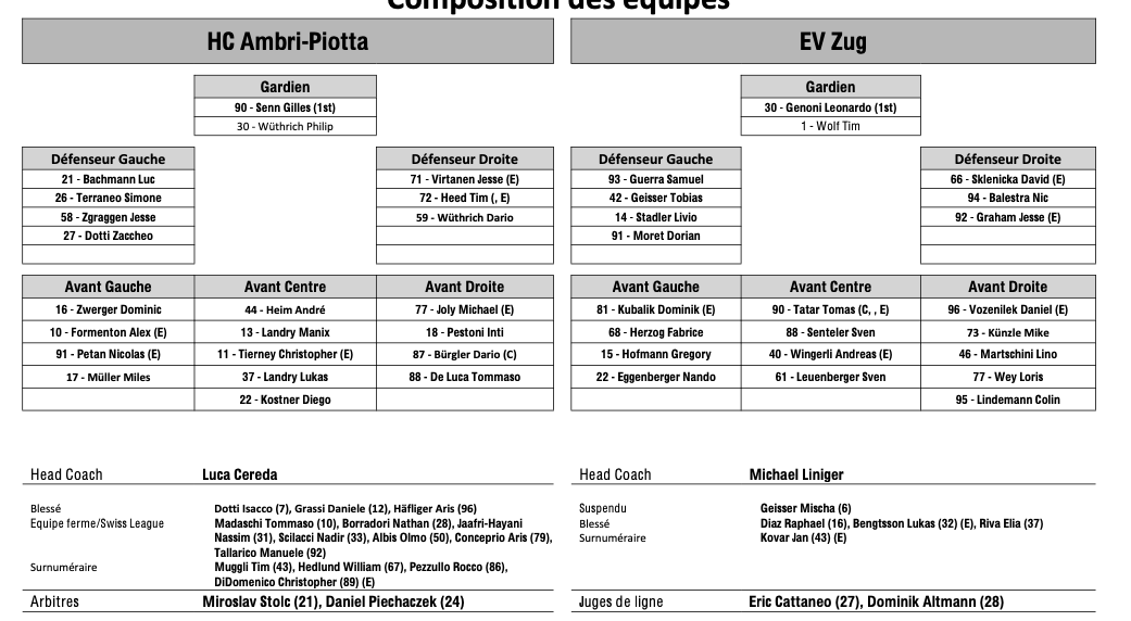 Formation des équipes et joueurs indisponibles pour le match Ambri vs Zoug 26/09/2025 Follow SwissHabs Derniers articles Il y a 15 heures Régis Fuchs sera honoré cette semaine Il y a 16 heures Prolongations de contrats à l'EHC Coire Il y a 18 heures Diego Kostner absent quelques semaines Il y a 18 heures Pontus Åberg passera les prochains matchs à Kloten Il y a 20 heures Deux autres renforts pour le HC Viège