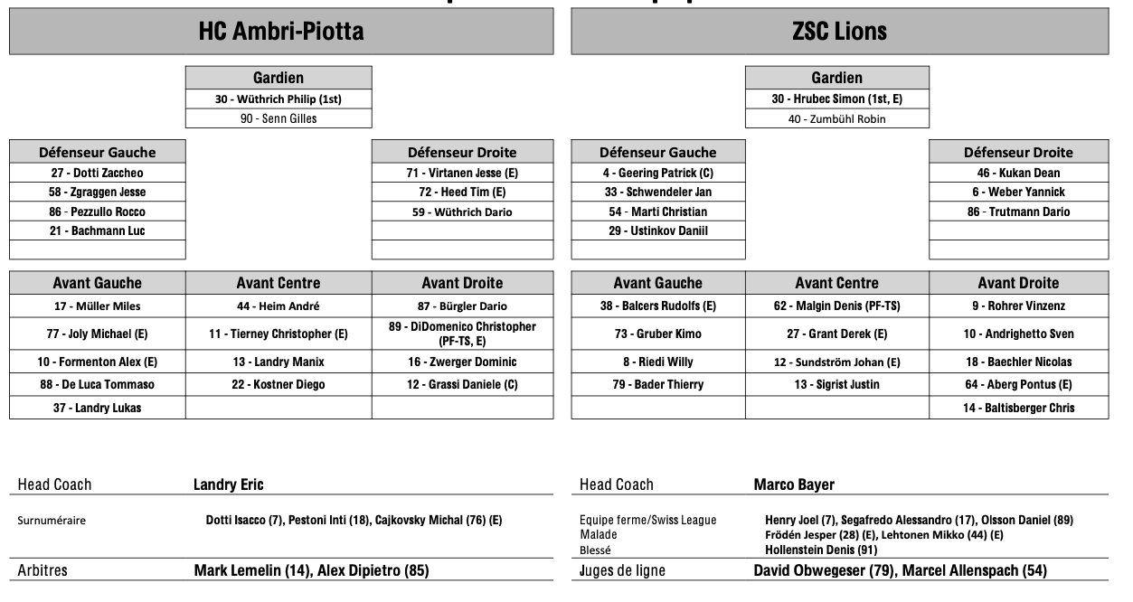 Formation des équipes et joueurs indisponibles pour le match Ambri vs Zurich 23/01/2026 Follow SwissHabs Derniers articles Il y a 17 heures Régis Fuchs sera honoré cette semaine Il y a 18 heures Prolongations de contrats à l'EHC Coire Il y a 20 heures Diego Kostner absent quelques semaines Il y a 20 heures Pontus Åberg passera les prochains matchs à Kloten Il y a 22 heures Deux autres renforts pour le HC Viège