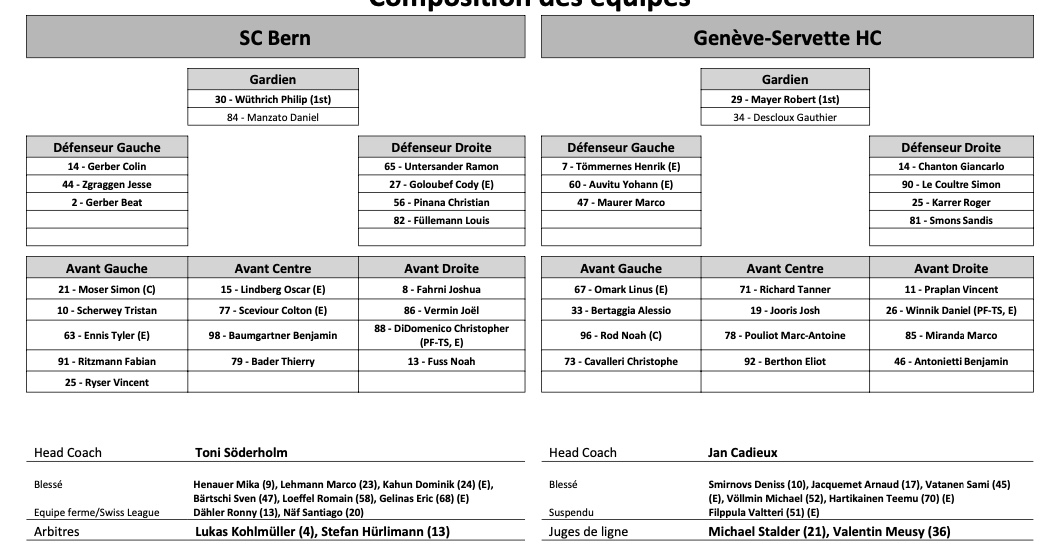 Formation des équipes et joueurs indisponibles pour le match Berne vs Genève 07/01/2023 Follow SwissHabs Derniers articles Il y a une heure Un mois d'absence pour Sidney Crosby Il y a 2 heures Changements au sein du département athlétique des SCL Tigers et SCL Young Tigers Il y a 4 heures Djurgården a toujours Emil Bemström dans son viseur Il y a 5 heures Grégory Hofmann en lice pour le plus beau but de cette saison de Champions Hockey League Il y a 6 heures Une nouvelle signature du côté d'Ajoie