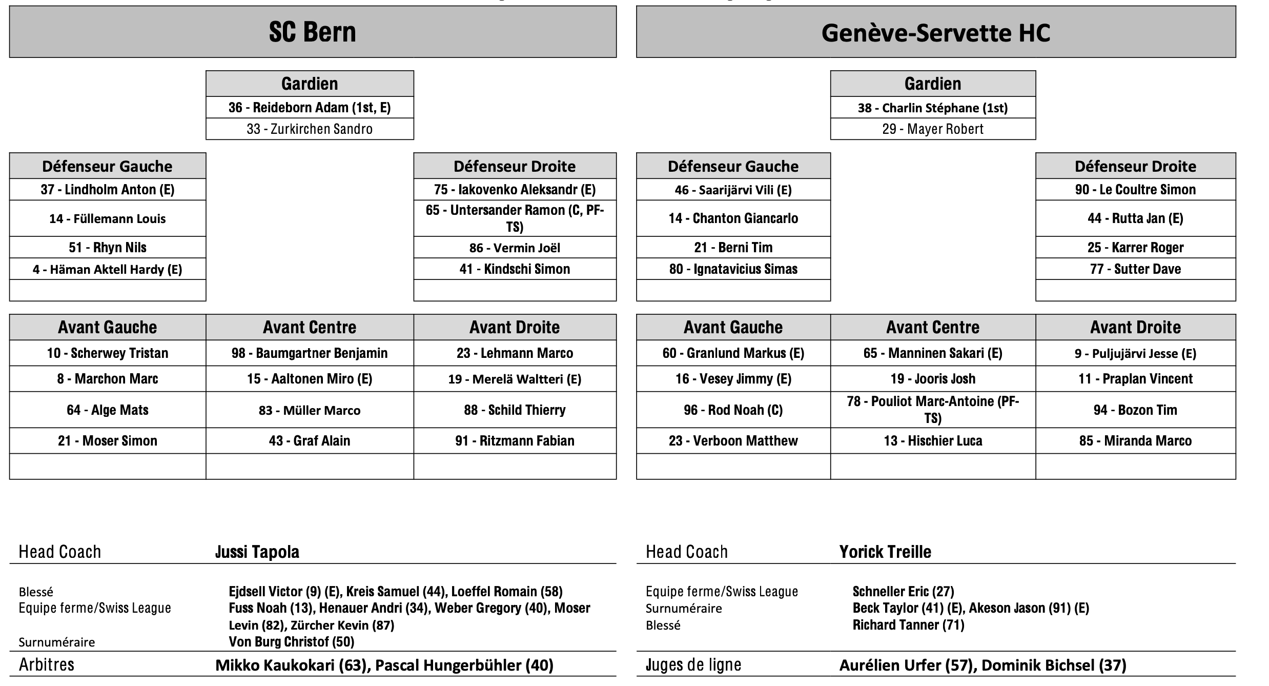 Formation des équipes et joueurs indisponibles pour le match Berne vs Genève 12/09/2025 Follow SwissHabs Derniers articles Il y a 18 heures Régis Fuchs sera honoré cette semaine Il y a 19 heures Prolongations de contrats à l'EHC Coire Il y a 21 heures Diego Kostner absent quelques semaines Il y a 21 heures Pontus Åberg passera les prochains matchs à Kloten Il y a 23 heures Deux autres renforts pour le HC Viège