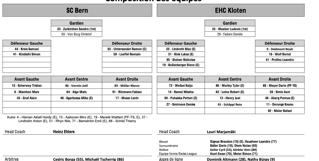 Formation des équipes et joueurs indisponibles pour le match Berne vs Kloten 24/02/2026 Follow SwissHabs Derniers articles Il y a une heure Echange entre les Penguins de Pittsburgh et l'Avalanche du Colorado Il y a 2 heures Formation des équipes et joueurs indisponibles pour le match Davos vs Langnau Il y a 2 heures Formation des équipes et joueurs indisponibles pour le match Rapperswil vs Genève Il y a 2 heures Formation des équipes et joueurs indisponibles pour le match Ambri vs Lausanne Il y a 2 heures Formation des équipes et joueurs indisponibles pour le match Zoug vs Fribourg