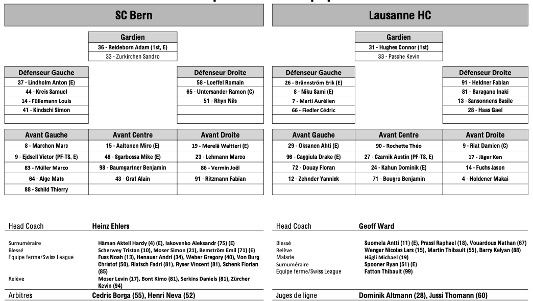 Formation des équipes et joueurs indisponibles pour le match Berne vs Lausanne 24/01/2026 Follow SwissHabs Derniers articles Il y a 15 heures Régis Fuchs sera honoré cette semaine Il y a 16 heures Prolongations de contrats à l'EHC Coire Il y a 18 heures Diego Kostner absent quelques semaines Il y a 18 heures Pontus Åberg passera les prochains matchs à Kloten Il y a 20 heures Deux autres renforts pour le HC Viège